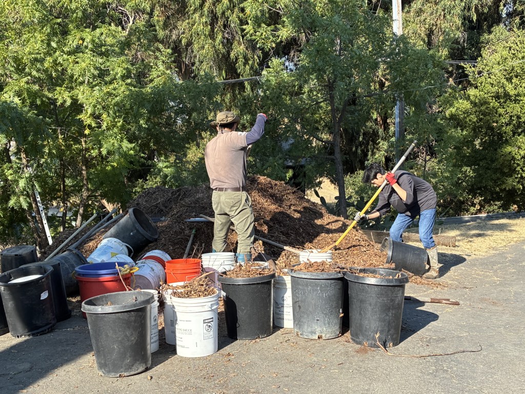Nhóm 3 đảm nhận nhiệm vụ đổ vụn gỗ vào những gốc cây. Đội trưởng anh Quế giải thích về quy trình trồng cây và việc vụn gỗ giúp giữ độ ẩm cho cây và ngăn cỏ dại phát triển.