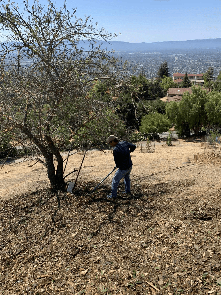 Như đã hẹn, trong tuần này công ty cây xanh đã đổ 3/30 xe woodchip xuống đồi dưới. Chú Tùng (Huệ Tâm) đã giúp kéo trải mỏng vụn gỗ xuống đồi. Công việc đơn giản nhưng trời hanh nóng nên các chú cháu làm cũng mau xuống sức (nhưng rất vui!)