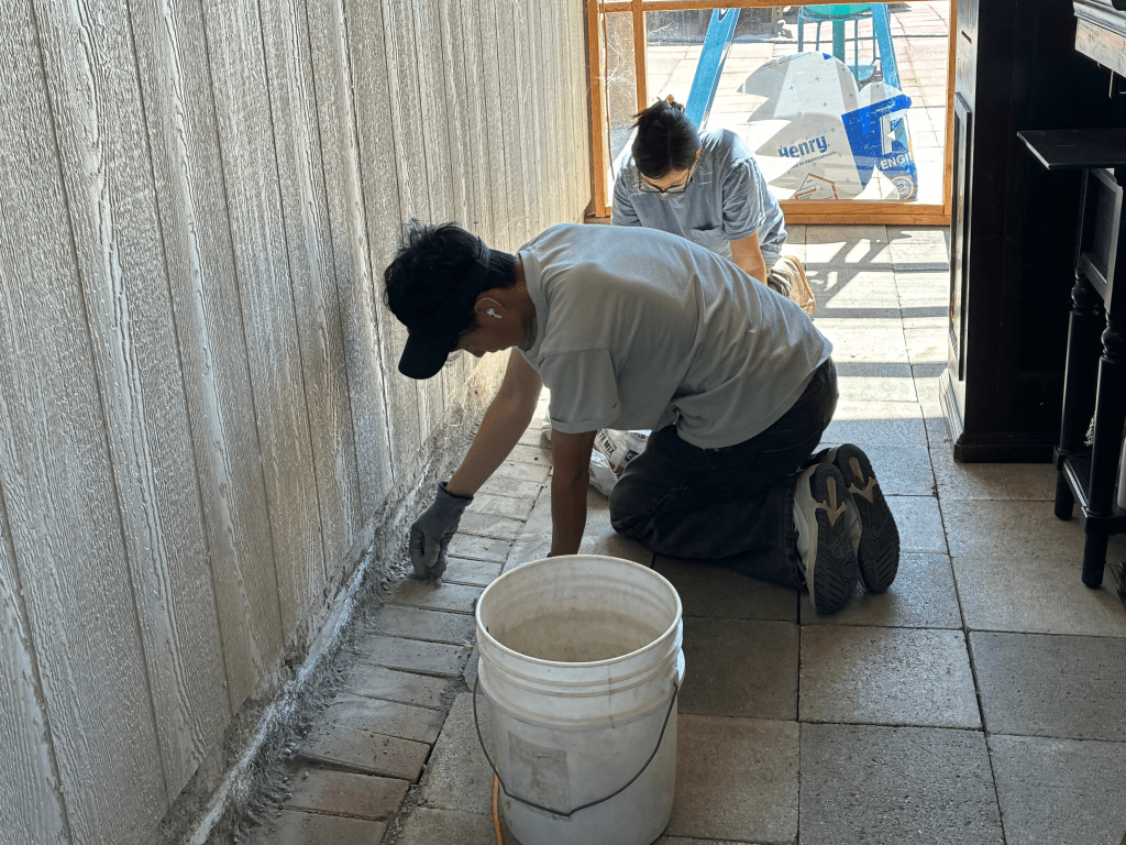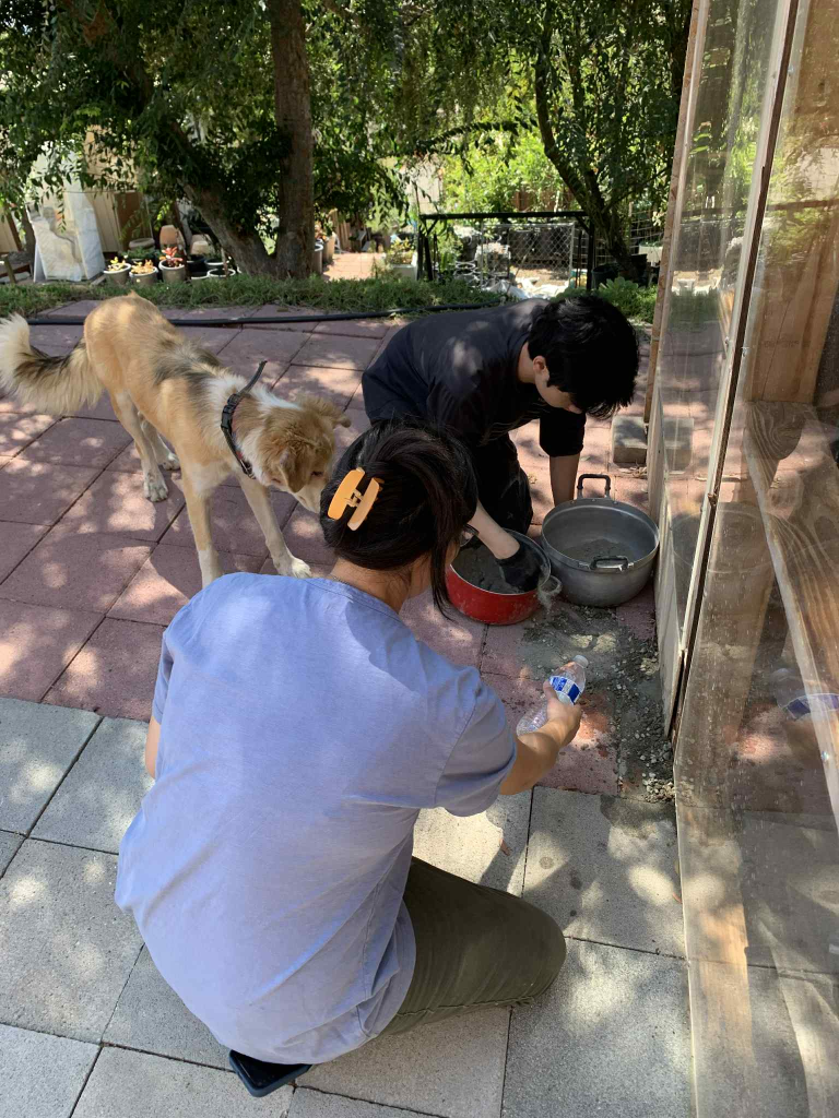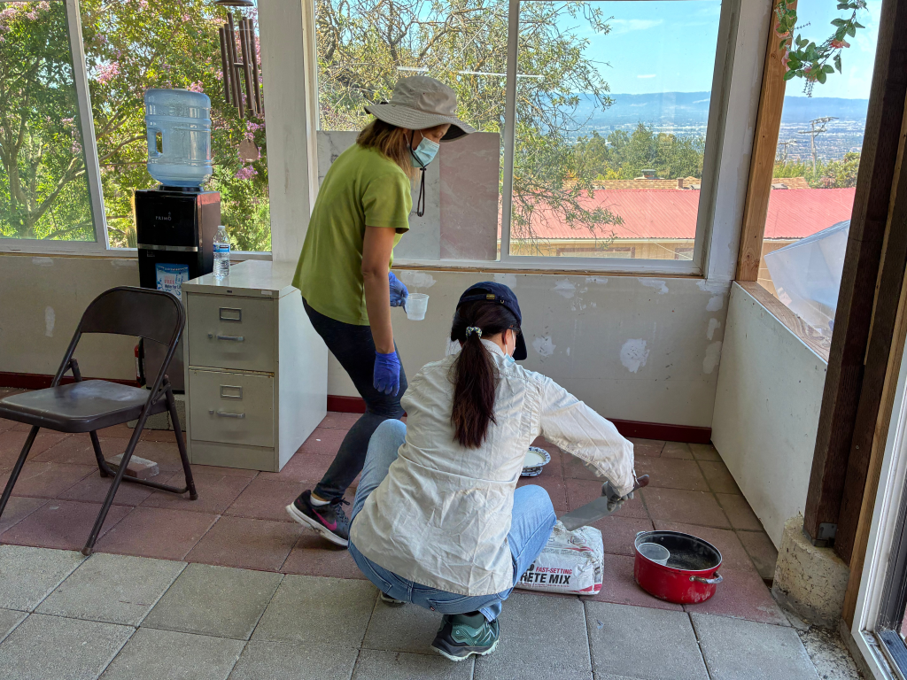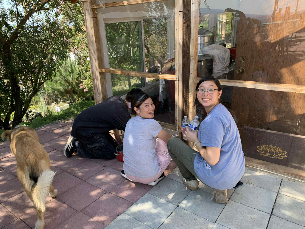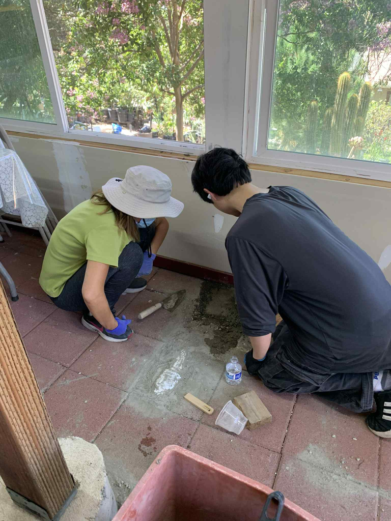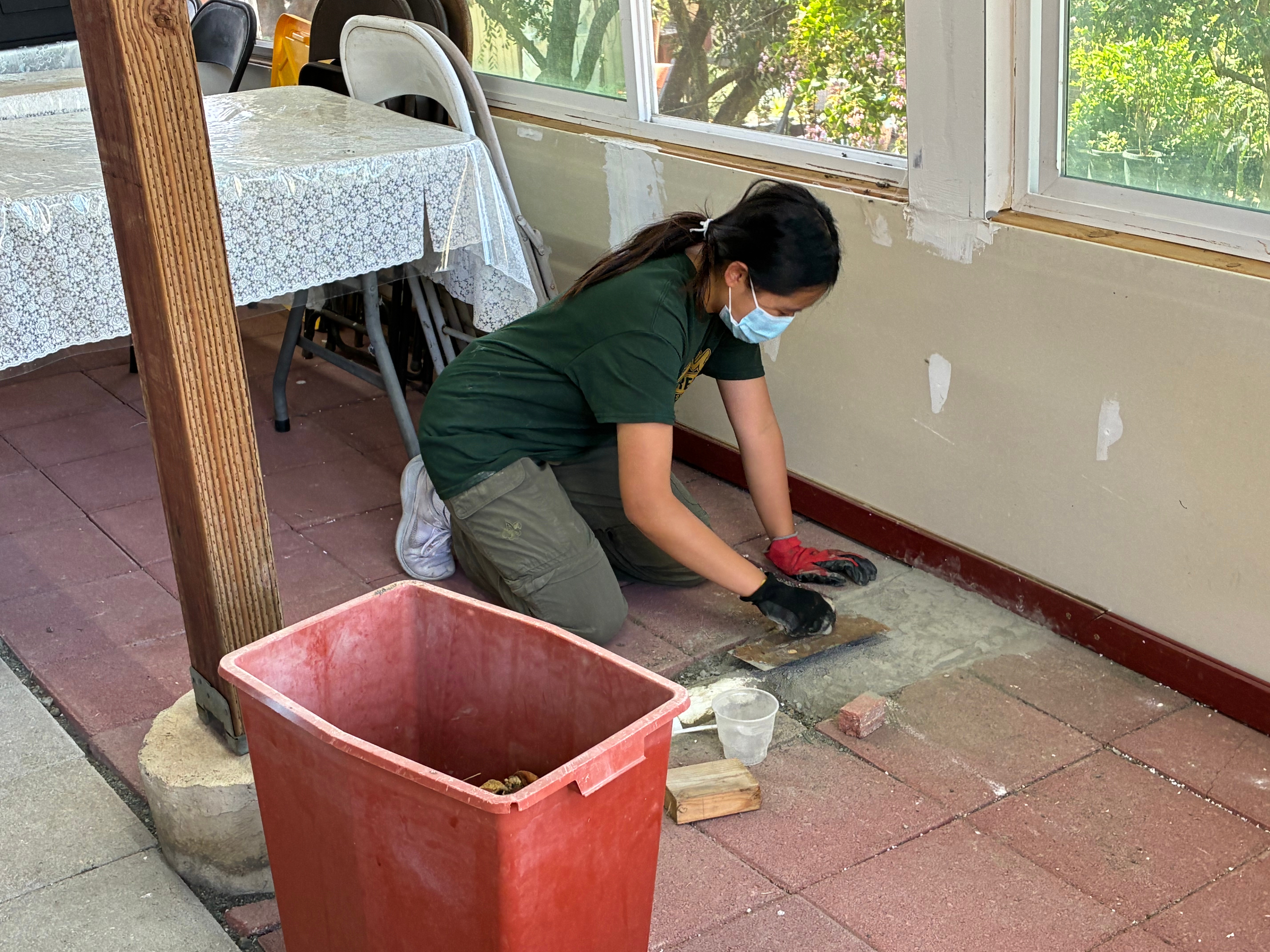 Trong một chủ nhật hè oi ả, chị Ngọc Lan, Brandon và các bạn tình nguyện viên boyscout đã trám xi măng vào những khe hở quanh nhà bếp, đề phòng chuột và gián xâm nhập.