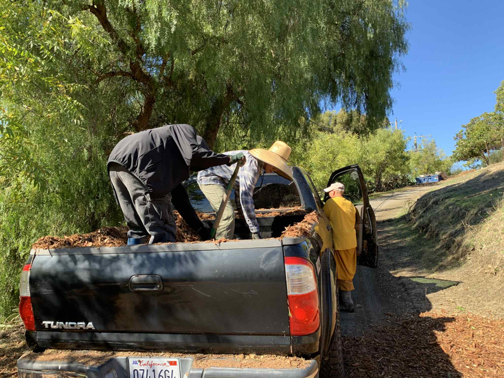 Công việc chính hôm nay là hoàn thành phần san lấp woodchip cho các gốc cây mới trồng còn thiếu ở khu vực đồi dưới, đồng thời trải thêm dọc theo lối đường nhựa để hạn chế tình trạng bùn đất bám vào bánh xe sau những cơn mưa.