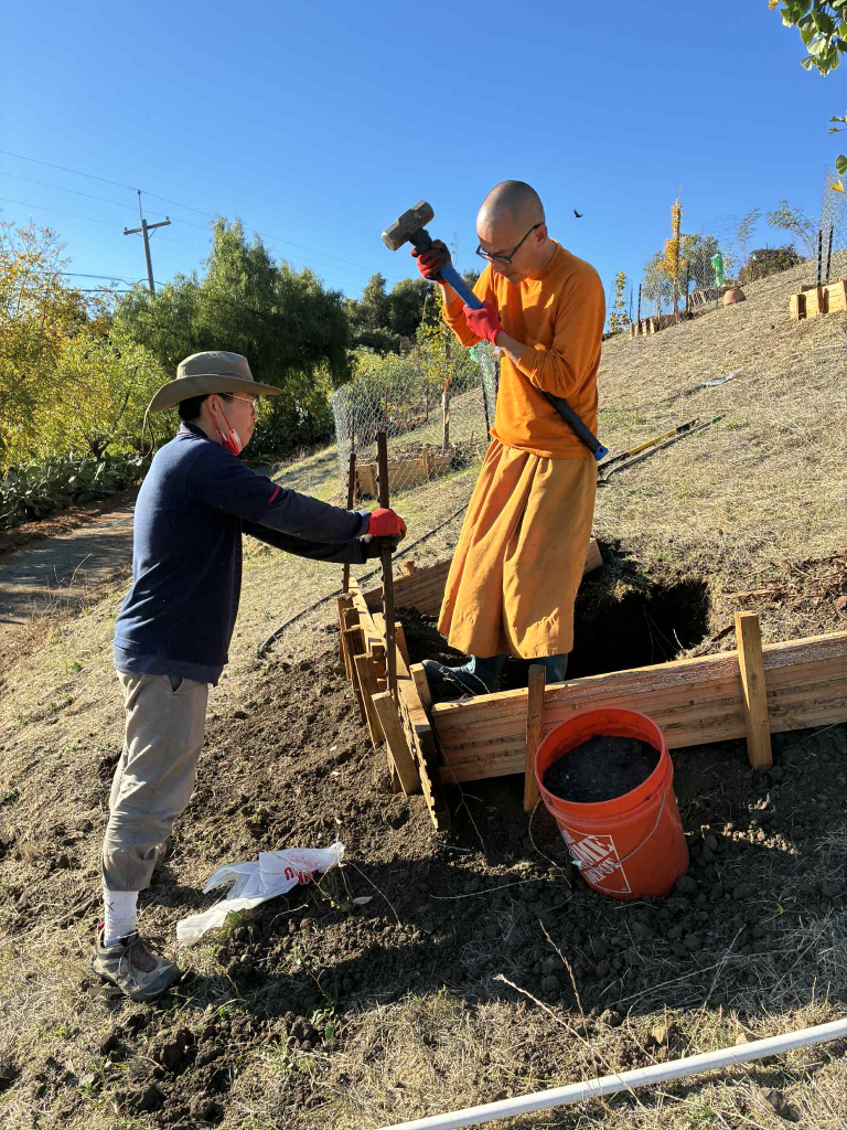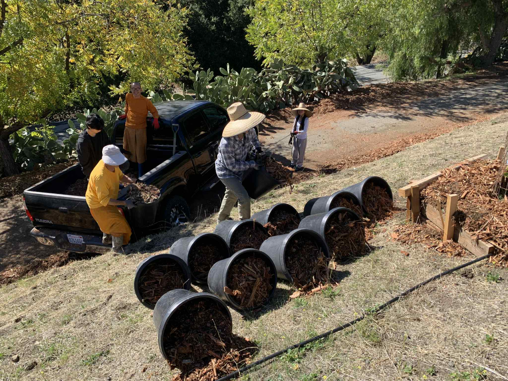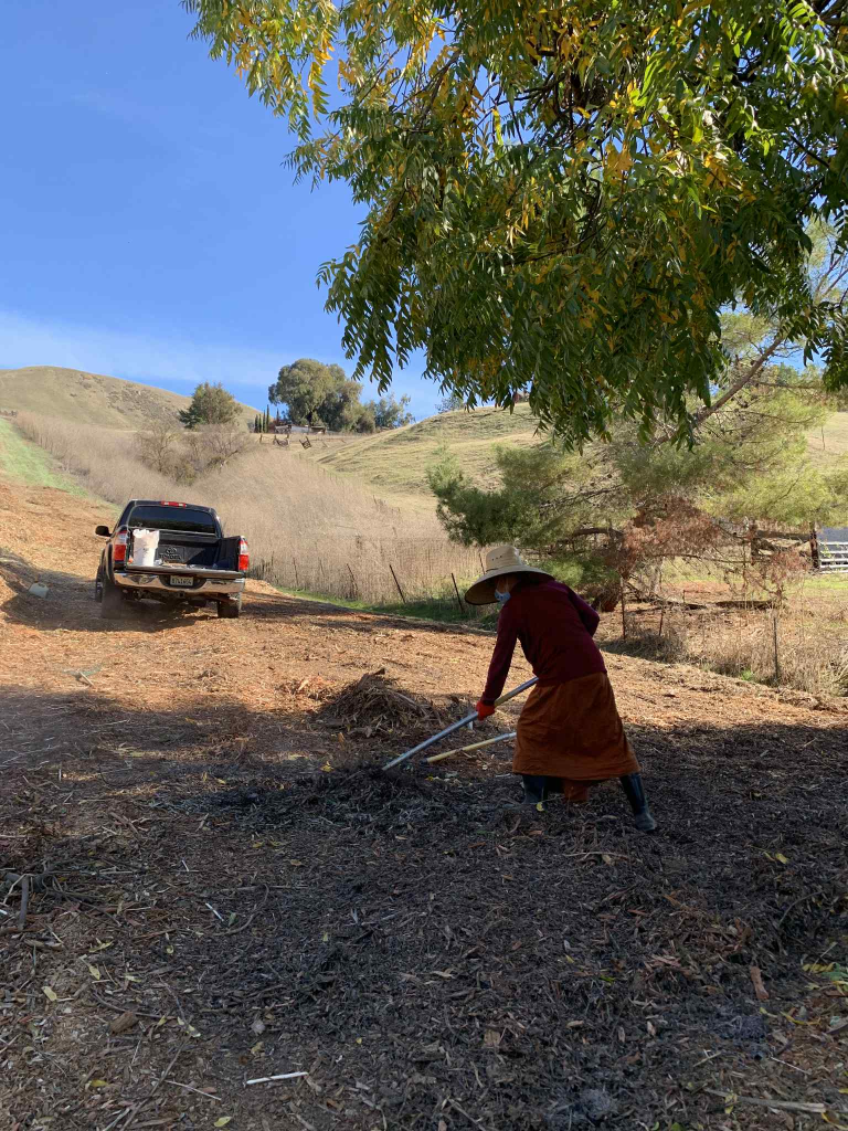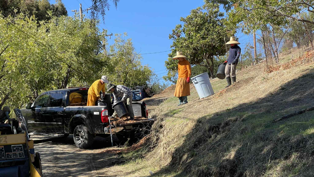 Song song đó, quý thầy Viên Tâm, Cô-Sa-La và bạn TNV Kevin đã dành cả buổi sáng để cắt tỉa lại thảm cỏ ở khu vực đồi dưới, dọn sạch những nhánh khô còn sót lại và san đều lớp woodchip phủ lên mặt đất. Dưới cái nắng dịu của đầu đông, công việc diễn ra trong không khí yên ả, chậm rãi nhưng tràn đầy nhiệt tâm. Nhờ vậy, khu đồi dưới nay trở nên gọn gàng, sáng sủa hơn, sẵn sàng cho đợt trồng cây vào mùa xuân năm tới.