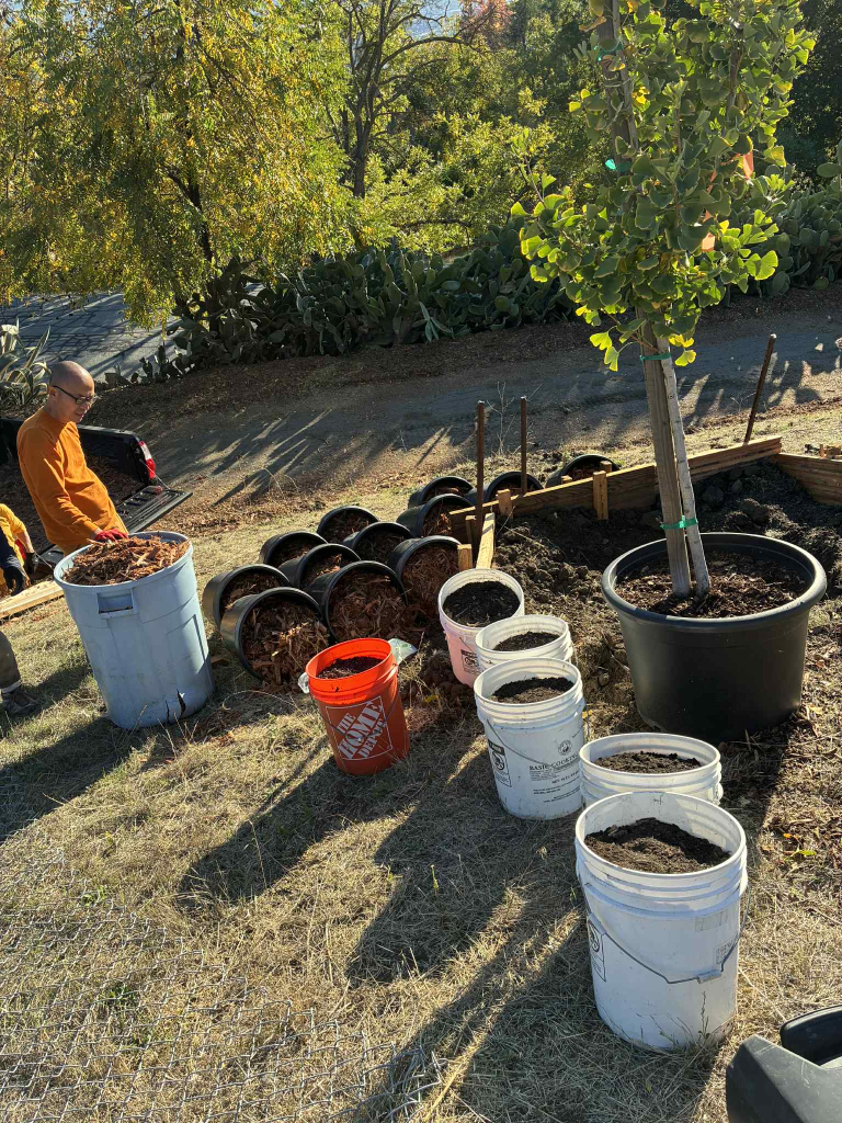 Sau giờ cơm trưa, thầy trò lại tiếp tục công việc: chở tất cả dụng cụ cần thiết, đất trồng, mùn cưa, phân bón và quan trọng nhất là chậu cây ginkgo 25gal. Thực sự phải cần đến bốn (04) người mới có thể nhấc và chuyển vào thùng xe bán tải thành công cũng như kéo chậu cây lên vị trí trồng.