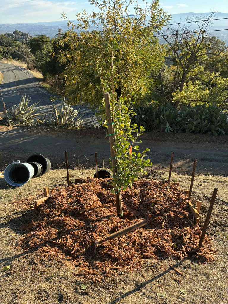 Sau đó, phủ một lớp vụn gỗ quanh gốc và chỉnh nhẹ cho cây hơi nghiêng về phía đồi, nhưng ngọn vẫn giữ thẳng để đón nắng đều. Cuối cùng, tưới thêm một lần nữa để cố định đất và giúp kích thích rễ phát triển mạnh.